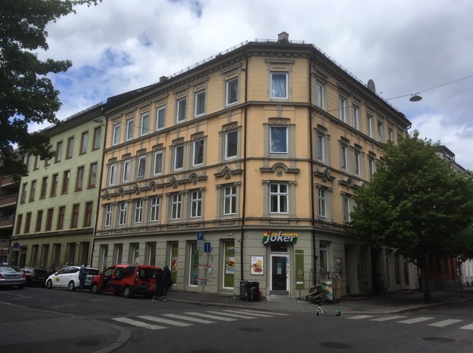 Nå forflytter vi oss ned til krysset Urtegata og Motzfeldtsgata og til hjørnegården Urtegata 22. Her drev Kjærstad kolonial- og fruktbutikk i mors barndom, den ene med inngang fra Motzfeldtsgata, den andre på hjørnet (se fotografi fra rett etter 1900-årsskiftet og fotoet fra mai 2020). Ifølge Adressebok for Oslo for 1929 drev Kitty G. Kjærstad kolonialhandelen mens Alf Martin Kjærstad drev frukthandelen. Mor og hennes søster kjøpte for 5 øre skadde appelsiner og epler hos frukthandleren.