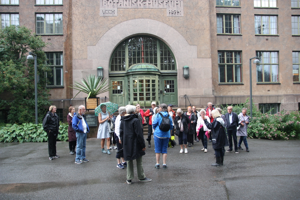 Vi var 26 personer som trosset regn, torden og lyn og fikk 2 inspirerende timer med botaniker Kristina Bjureke. Ved start strømmet regnet ned og vi ble derfor skysset innendørs i den ærverdige gråsteinsbygningen fra 1913, selve Botanisk museum. Bygningen er vanligvis lukket for allmenheten, men på grunn av været gjorde man et unntak. Vi benket oss i en liten undervisningssal for studenter og hun bemerket at så mange «studenter, hvorav mange i moden alder» var det sjelden hun hadde der. Det er ikke lenger så mange som søker seg til en rent botanikk-studie.