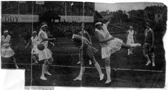 Bilde av den første kvinnefotballkampen i Norge i ukjent avis. Dame nummer to fra venstre er mor til forfatteren, Lill-Anna Dancke. Hun var 18 år på det tidspunktet.