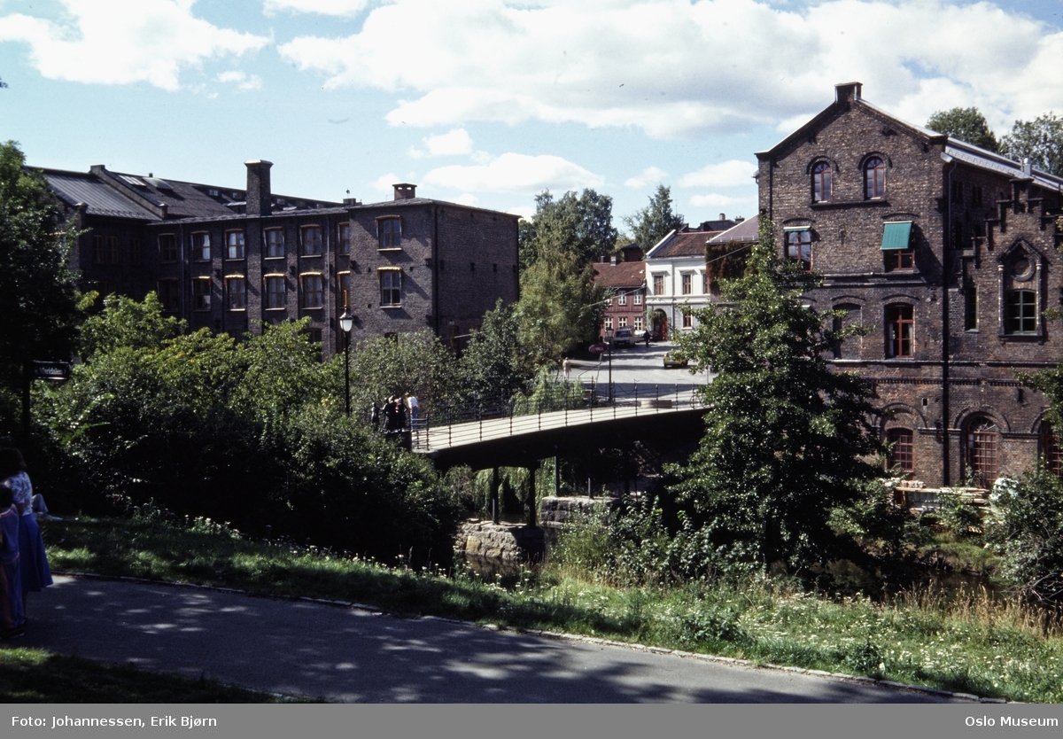 Bildet fra 1990 er av Beierbrua og på den andre siden av Akerselva ser du det hvite huset som er Arbeidermuseet.